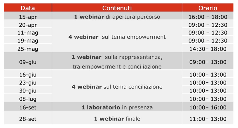 Il corso si articola in 12 incontri, per una durata complessiva di 40 ore e prenderà avvio il 15 aprile 2021.