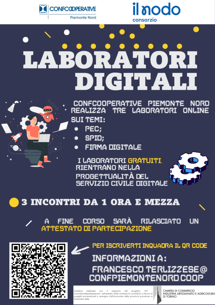 Sono in partenza i laboratori digitali di Confcooperative Piemonte Nord che prendono forma all’interno del Servizio Civile Universale Digitale e con il supporto del progetto I4T – Innovation4developement” nell’ambito della richiesta di contributi a favore di progetti promozionali a sostegno dell’economia della provincia promosso e finanziato dalla Camera di commercio industria e artigianato di Torino.