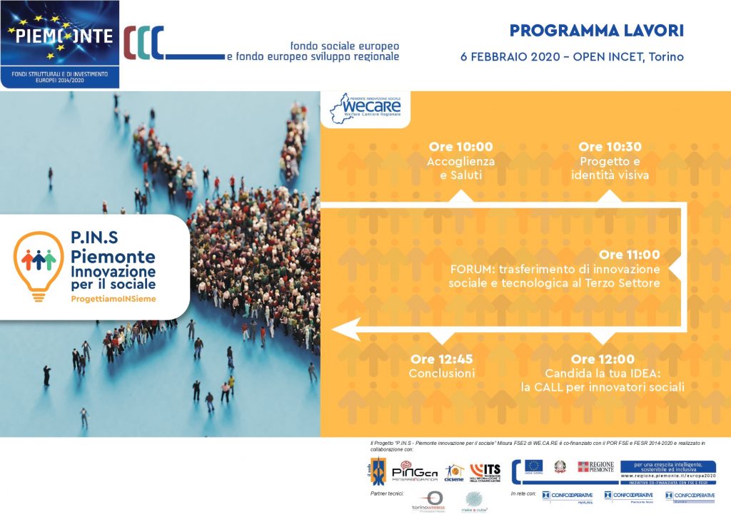 La mattinata vedrà protagonista il progetto P.IN.S. Piemonte Innovazione per il Sociale -realizzato nell’ambito della Misura FSE2 di WE.CA.RE, co-finanziato con il POR FSE e FESR 2014-2020, da Il Nodo c.s.c.s, Ping s.c.s., CICSENE, Fondazione Istituto Tecnico Superiore per le Tecnologie della Informazione e della Comunicazione e in collaborazione con Make a Cube³, Torino Wireless, Confcooperative Piemonte, Confcooperative Piemonte Nord e Confcooperative Cuneo– insieme agli interventi dei principali attori in ambito di innovazione tecnologica e sociale e le parti del Terzo Settore.